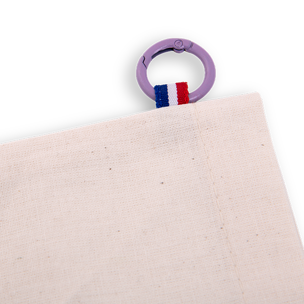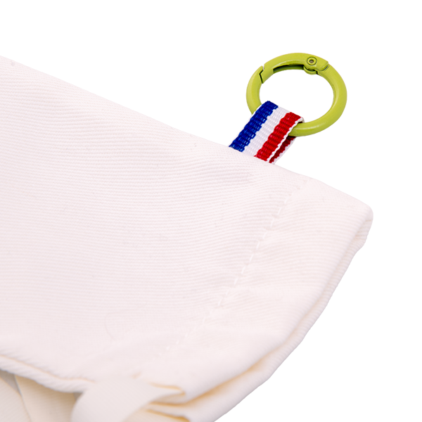 Anneau mousqueton à glisser dans le ruban bleu blanc rouge de l’étui standard afin de garder la marinette accrochée au sac ou à la ceinture, à portée de main en rando ou en outdoor.